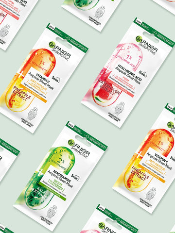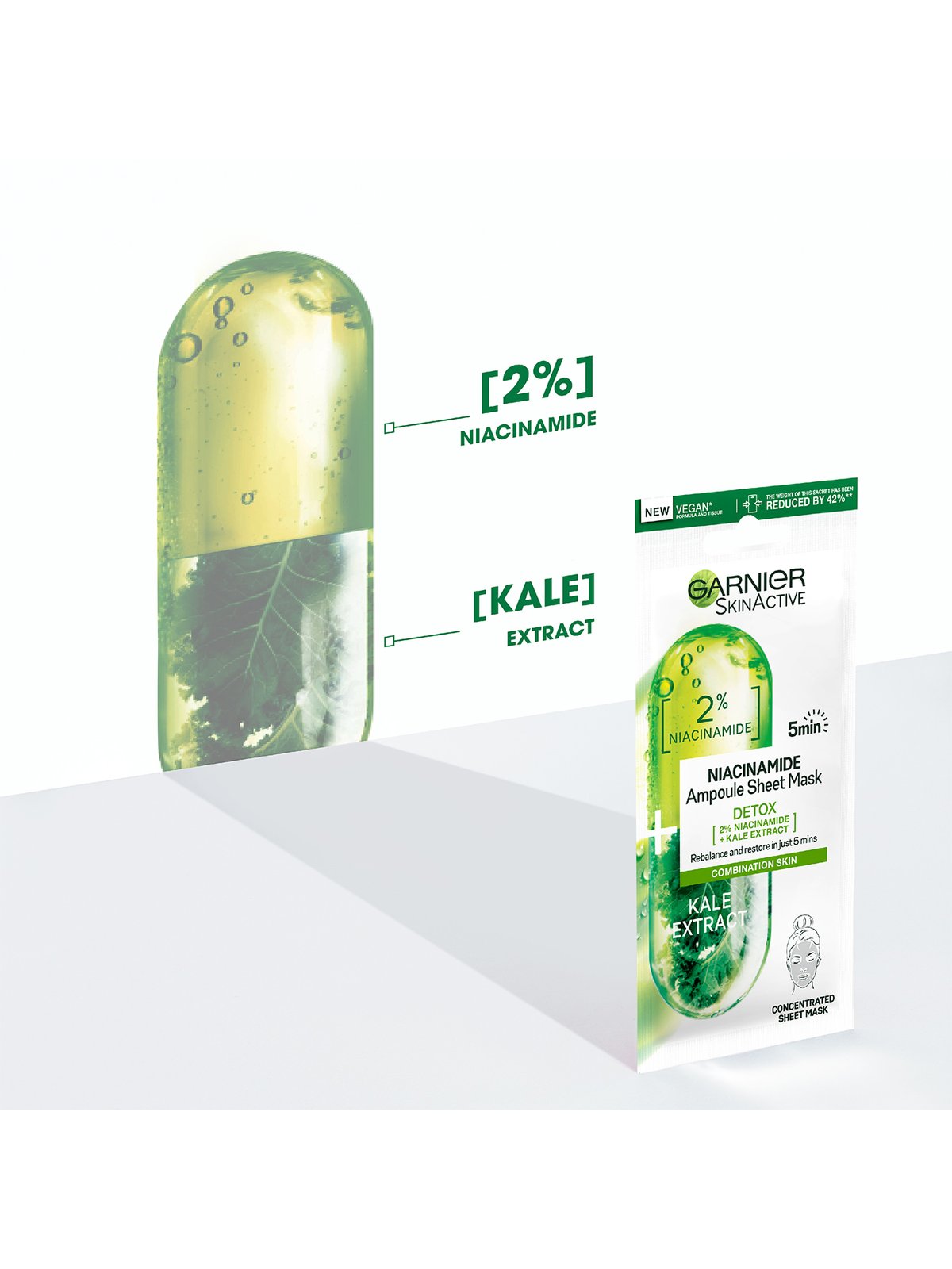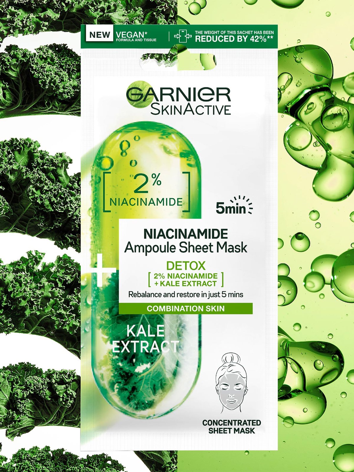 Garnier fast action Niacinamide + Kale ampoule sheet mask combines a potent derm active with a natural origin ingredient for a hydrating detox that rebalances dry and oily areas in just 5 mins! This sheet mask is made with both a vegan* formula and tissue.