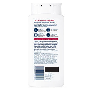 Developed with dermatologists, CeraVe Eczema Soothing Body Wash, an ultra-gentle formula, cleanses and calms extra dry, itchy skin. The formula contains hyaluronic acid to attract needed moisture to skin?s surface and three essential ceramides (1, 3, 6-II) to help repair the skin?s protective barrier.
