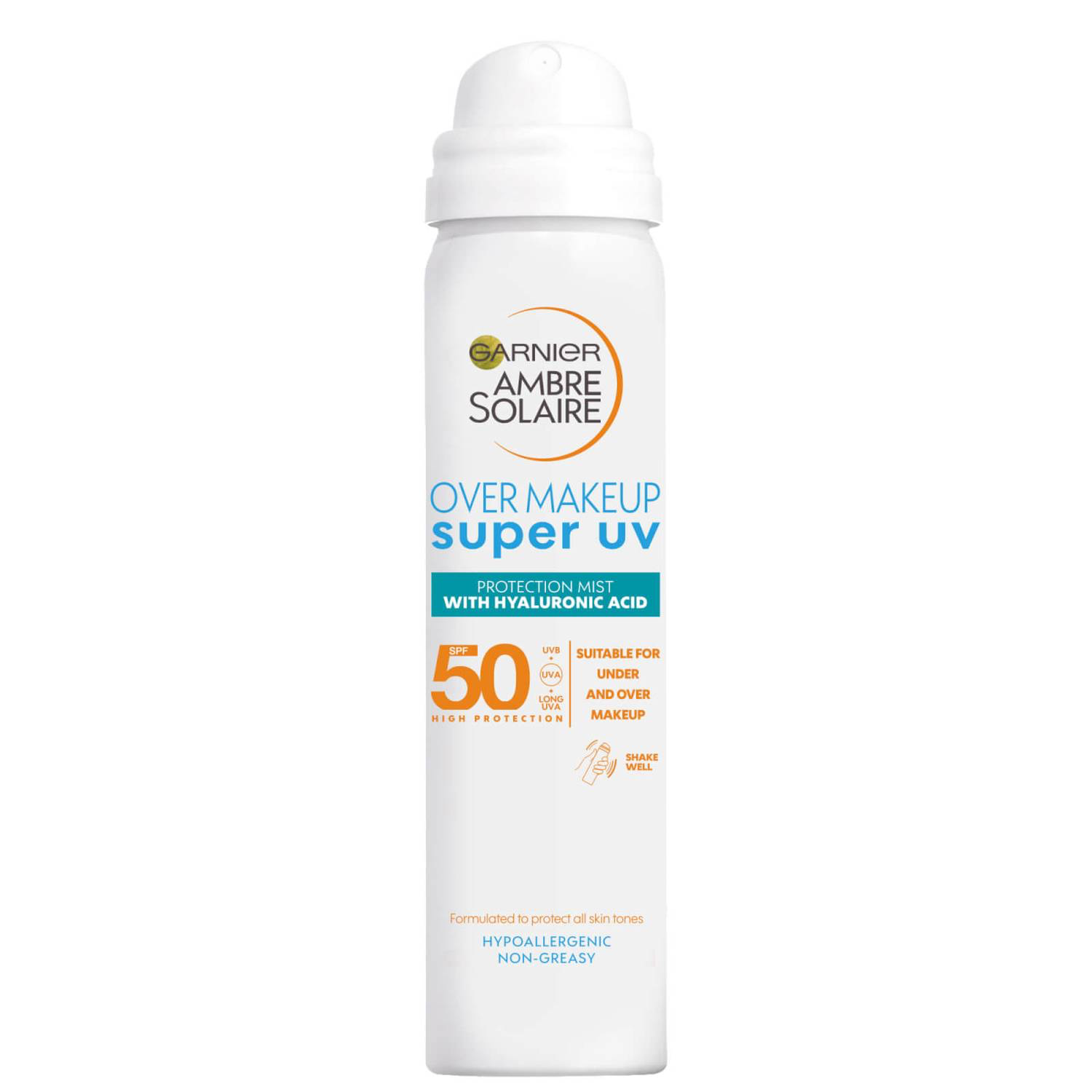 Protect and refresh skin with the Garnier Ambre Solaire Over Makeup Super UV Protection Mist. Featuring an SPF50, the lightweight mist can be applied under or over makeup, offering protection from harmful UVA and UVB rays.